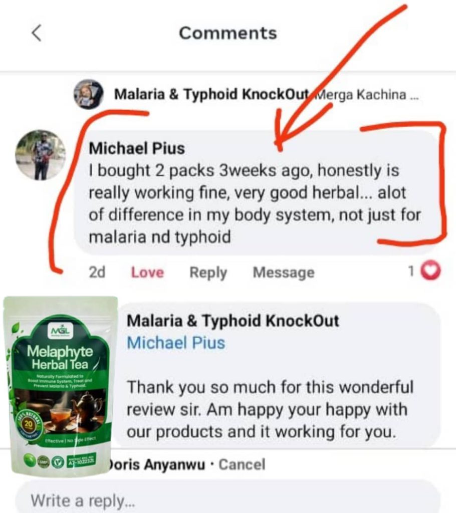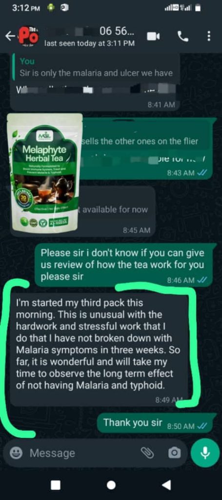 I haven’t had malaria in months, and my typhoid symptoms are gone too. This tea deserves national recognition. I now buy it in bulk for myself and my siblings. If you’re looking for something that works naturally without side effects, Melaphyte it is.